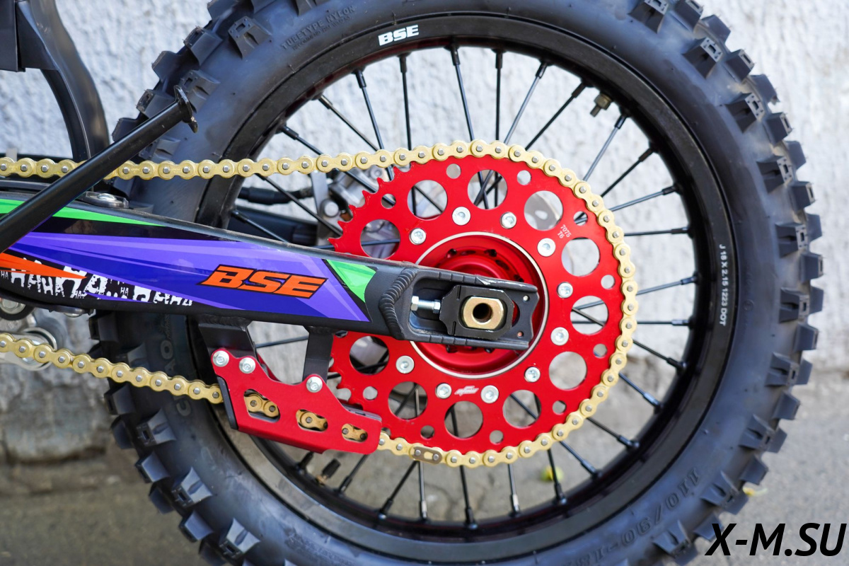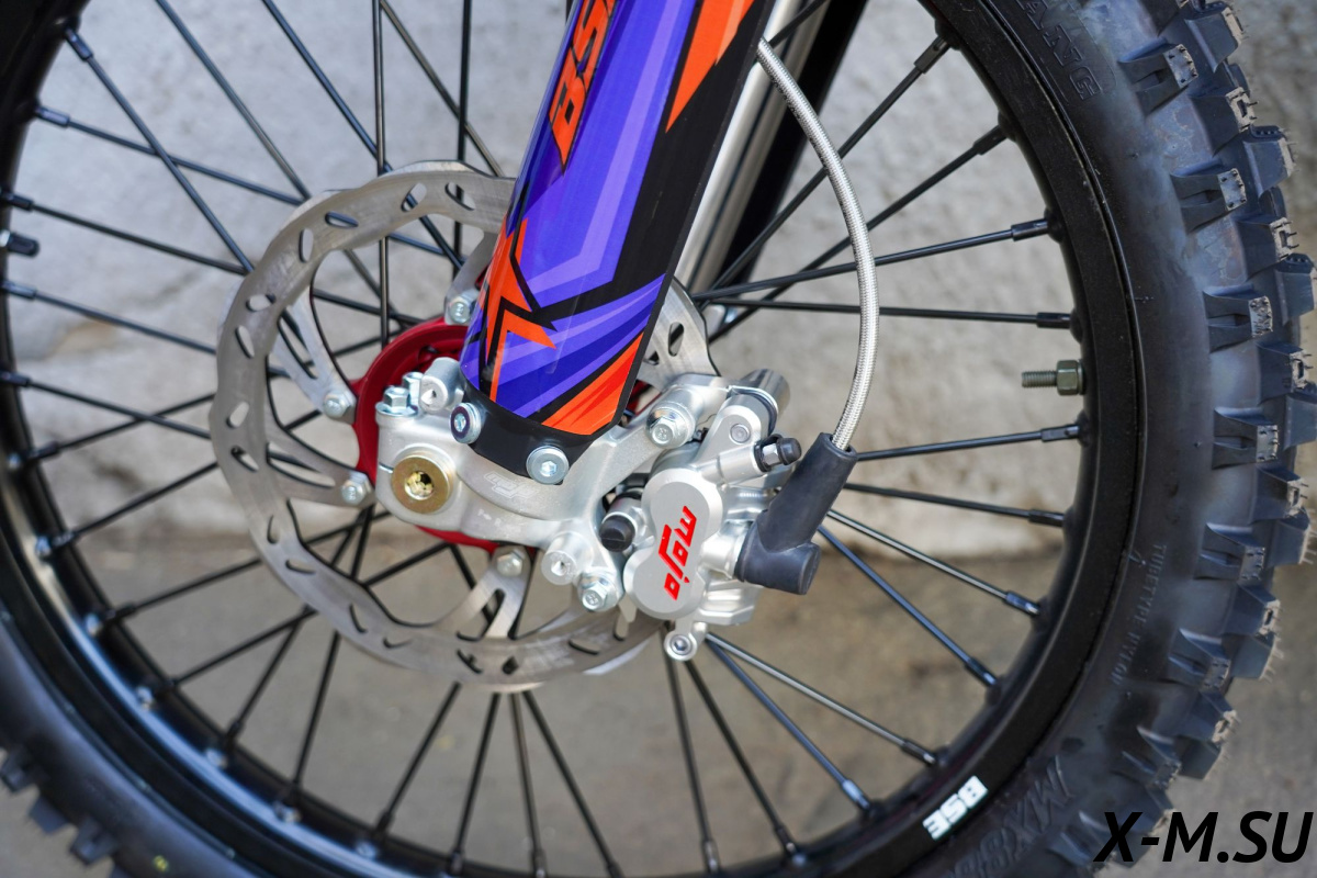 Передняя двухкамерная вилка с закрытым картриджем имеет полный диапазон регулировок, диаметр перьев - 48 мм, длина вилки – 930 мм, ход - 280 мм. Сзади установлен полностью настраиваемый моноамортизатор BSE Mojo Racing длиной 480 мм и ходом 120 мм. Подвеска с большими ходами помогает отрабатывать даже самые жесткие приземления, с лёгкостью "глотая" все неровности. Подвеску легко настроить под любой рельеф, любую трассу и стиль езды. Вы ощутите результат, когда будете сокращать секунды круг за кругом! Разработка подвески Mojo Racing производилась опытными инженерами-подвесочниками завода, а настройка — под чутким контролем заводской спортивной китайской командой BOSUER. Особое внимание было направлено на снижение веса всей подвески. Установлены новые усиленные CNC траверсы вилки.