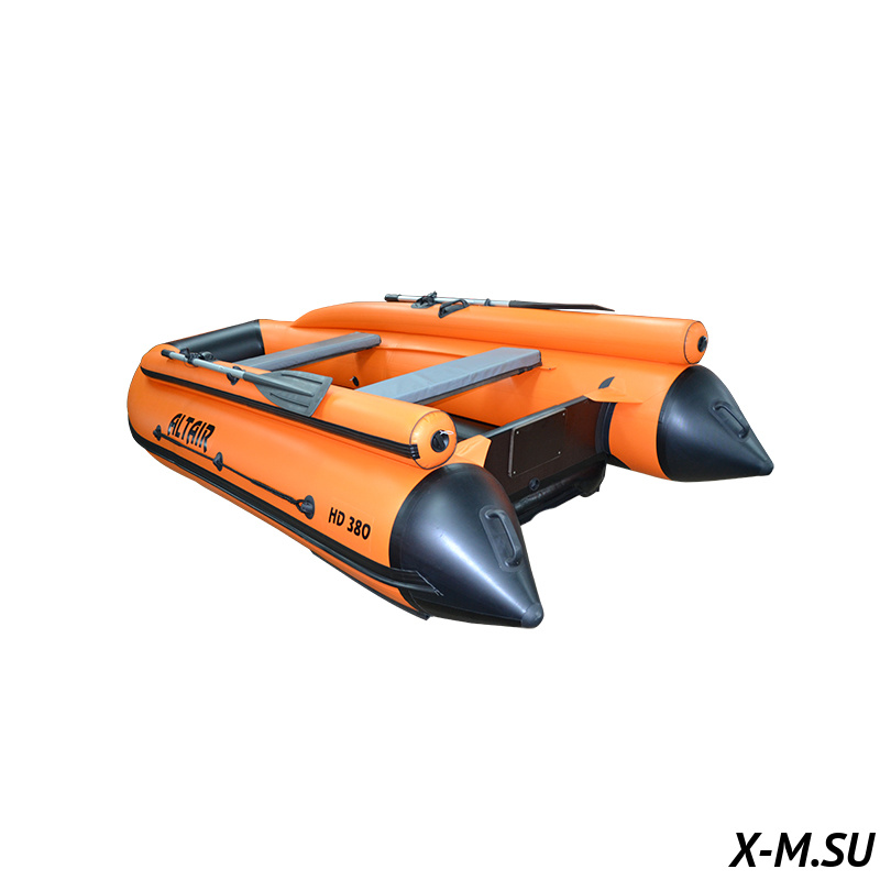 Лодка ПВХ надувная HD-380 НДНД с фальшбортом заметно проще в эксплуатации и намного легче пайольных собратьев. И как следствие мы получили отличное скольжение по водной глади за счёт оригинальной конструкции надувного дна. С первых минут движения на лодке ПВХ с дном конструкции ALTAIR HD создается ощущение комфорта и безопасности. Чтобы прояснить ситуацию, заметим, что за основу при его разработке была взята известная конструкция “Морской дротик”. Таким образом удалось адаптировать жёсткий корпус в “надувном” формате.